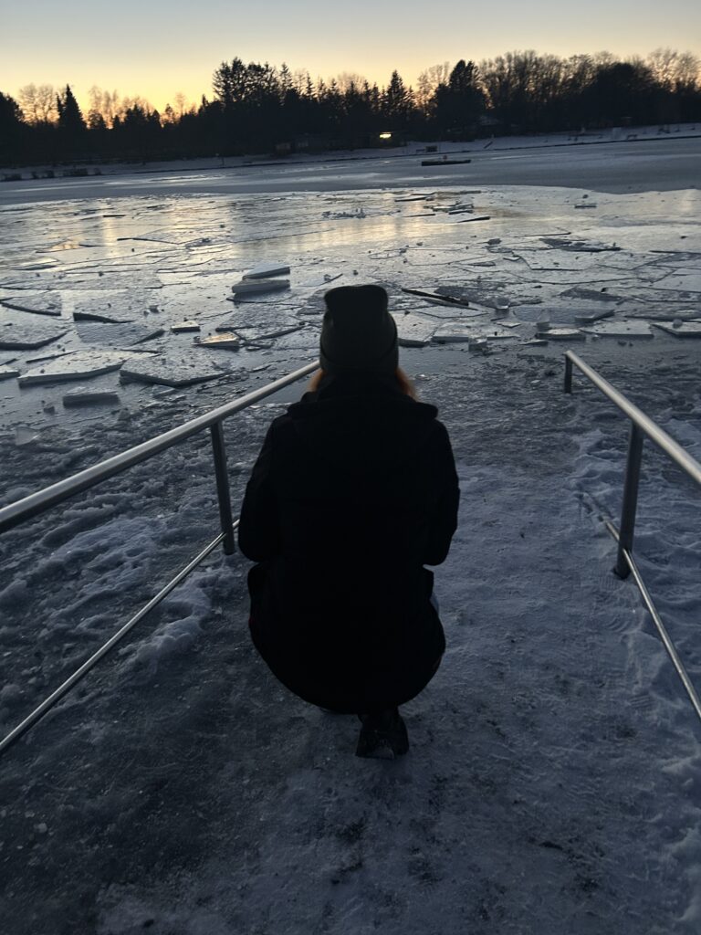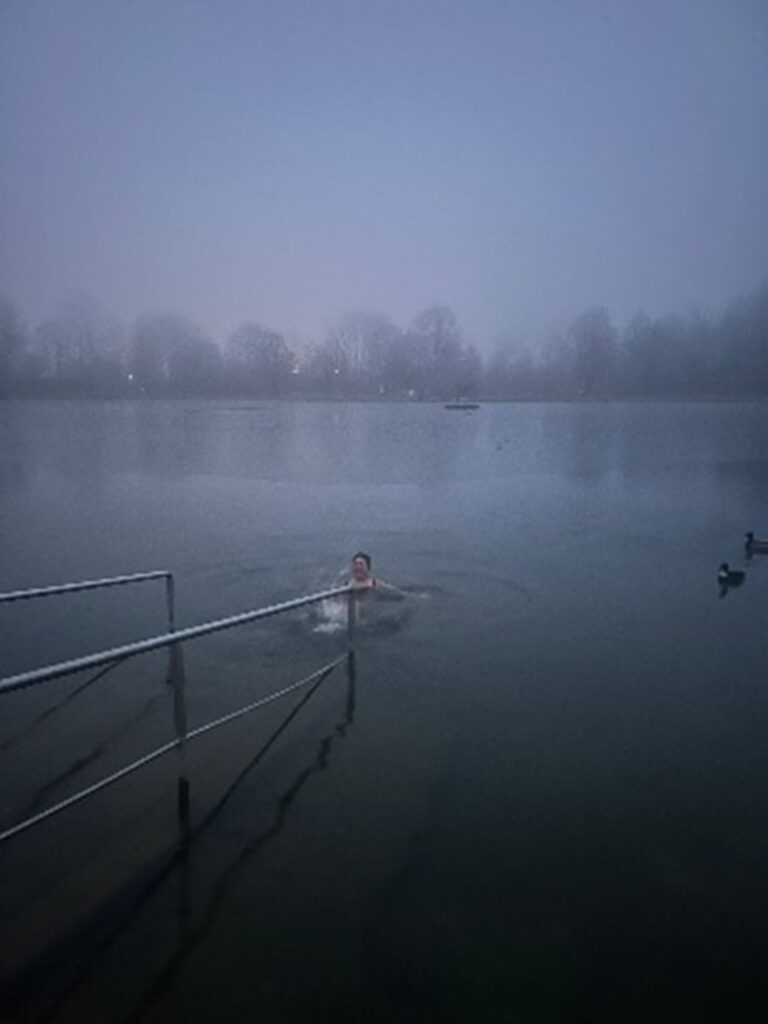 Derzeit ist schwimmen nicht möglich, da der See zugefroren ist. Schon als Kind war ich verärgert, wenn die Eisdecke aufgebrochen wurde oder Steine drauf geworfen wurden. Ich denke, die Natur hat viel Kraft gebraucht, diese Eisdecke zu bilden und es ist nicht an mir. diese zu zerstören. Ich warte auf wärmere Temperaturen.